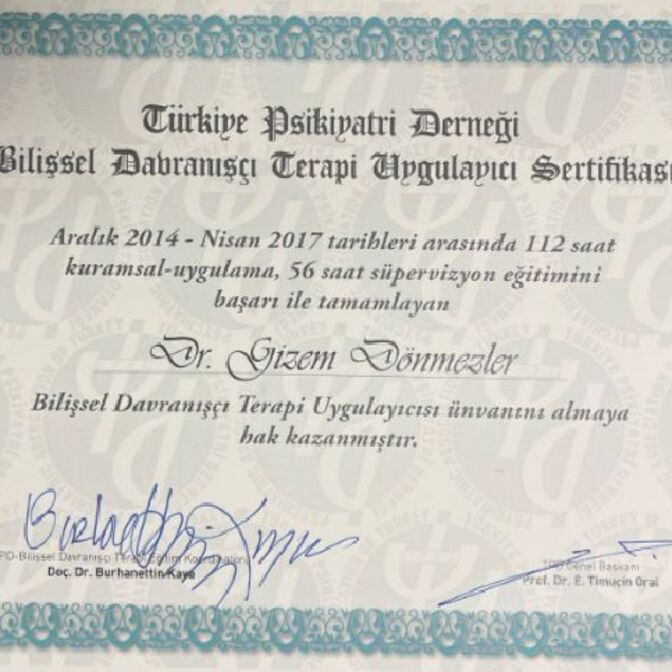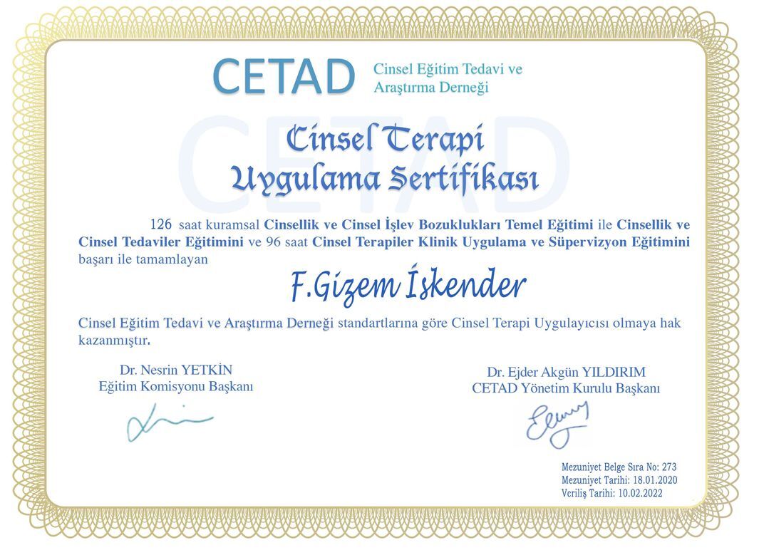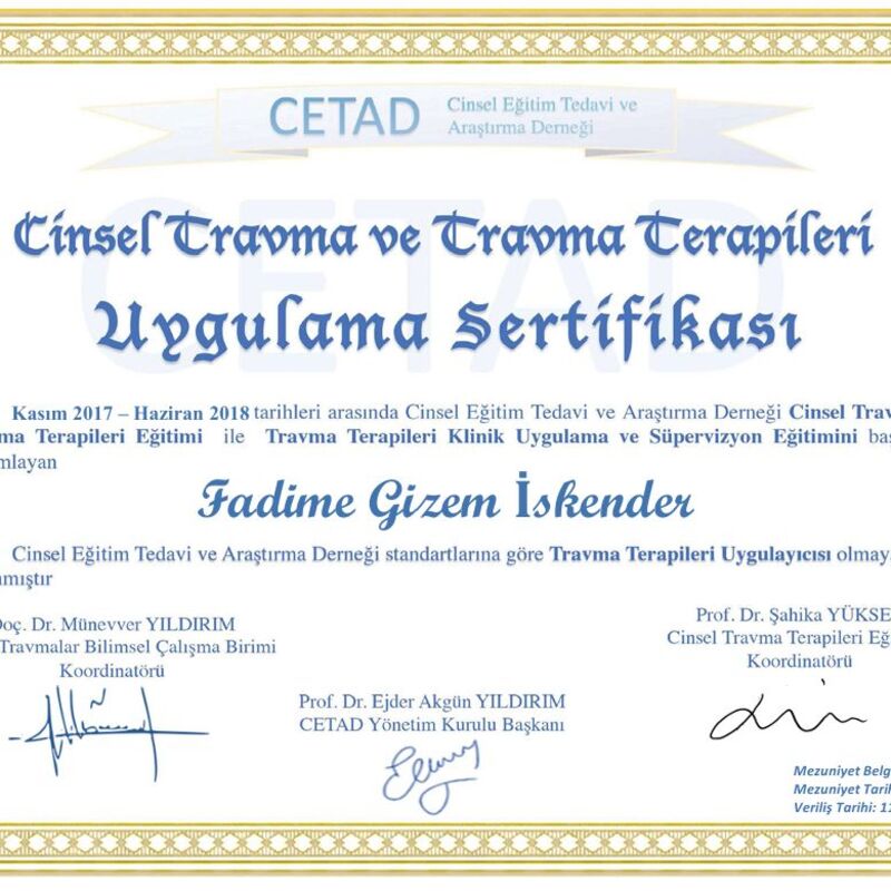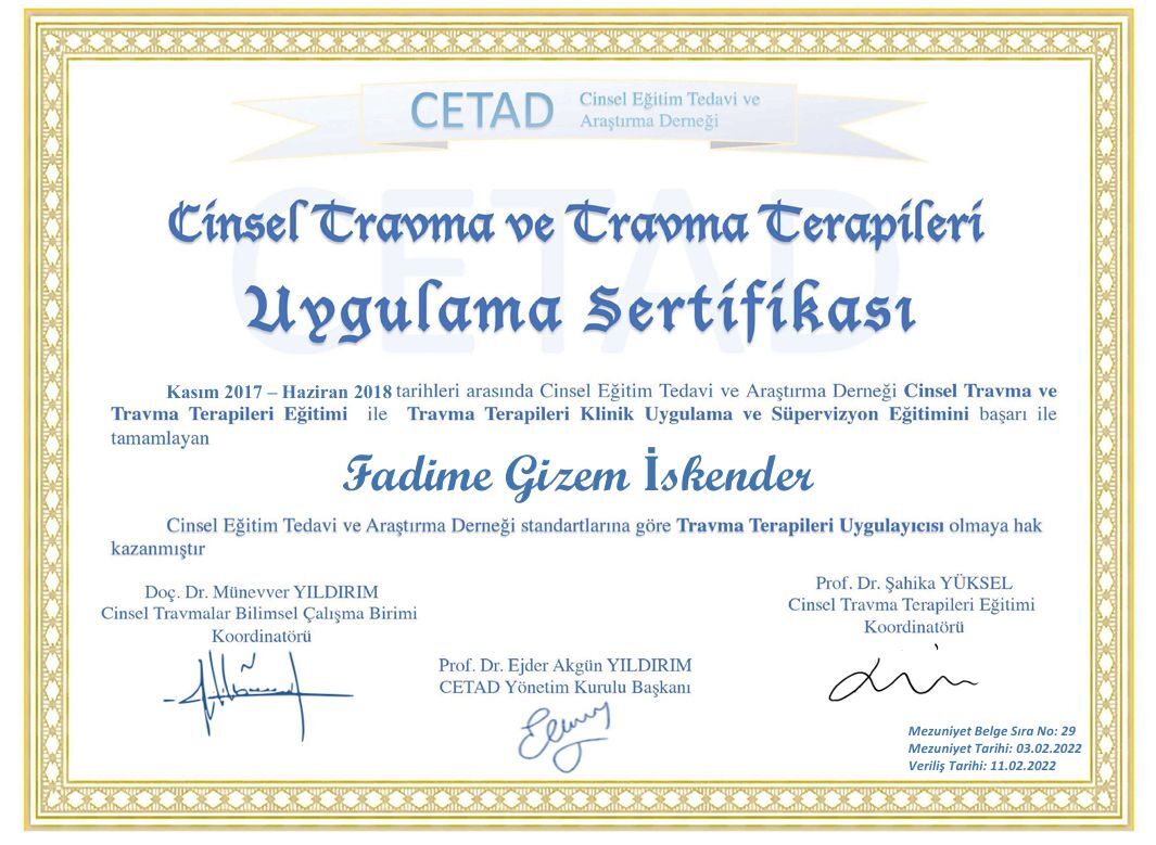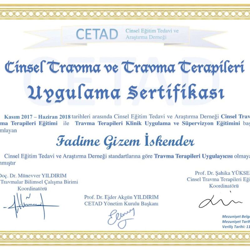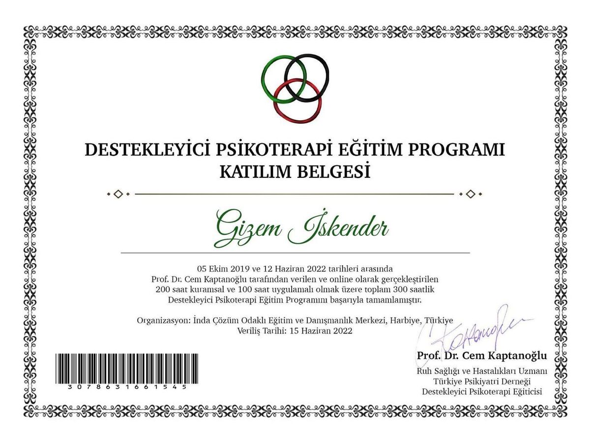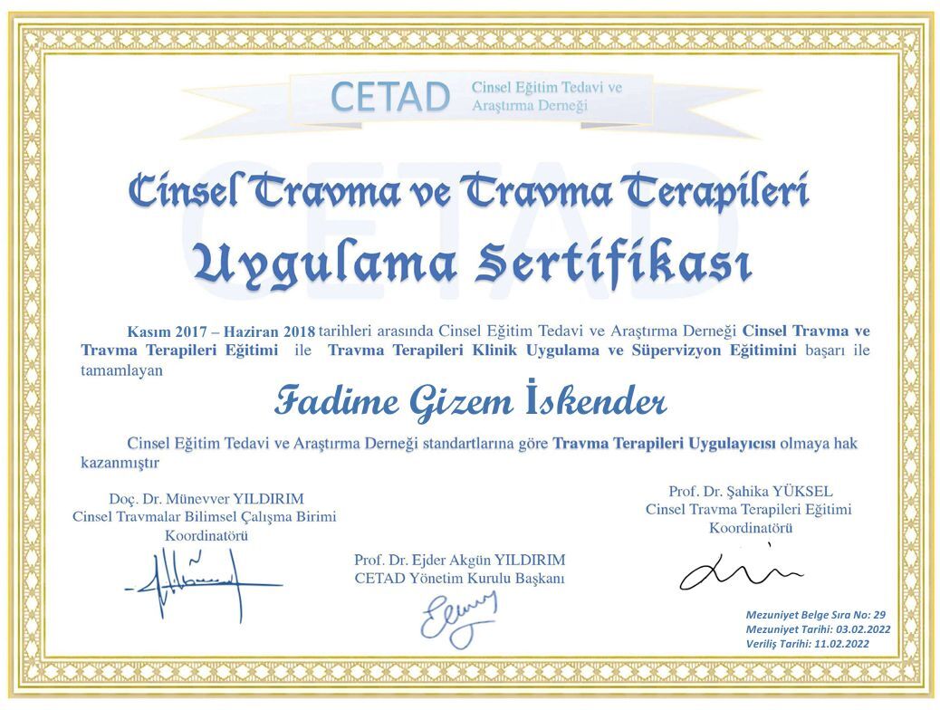 Psikoterapi alanında çeşitli eğitimler tamamladım: Destekleyici Psikoterapi, Travma Terapileri, Bilişsel Davranışçı Terapi, Cinsel Terapi. Kendi bireysel psikanaliz sürecimden geçtim. Bugün çalışmalarımda etik ilkelere bağlı, bilimsel temelli ve bütüncül bir yaklaşımla ilerliyorum.